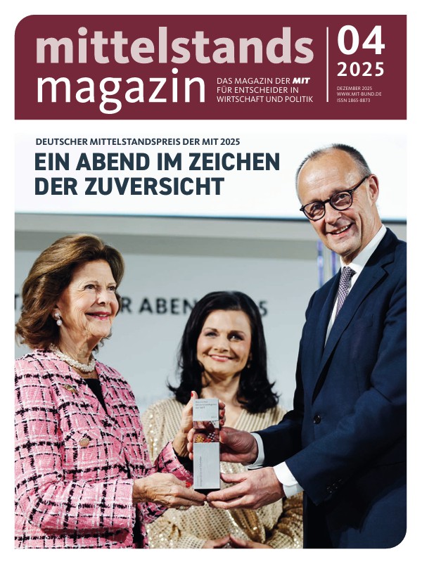 Das neue Mittelstandsmagazin ist da! In dieser Ausgabe lesen Sie alles über die glanzvolle Verleihung des Deutschen Mittelstandspreises der MIT. Stargast des Abends war Ihre Majestät Königin Silvia von Schweden, die den Preis aus den Händen von Bundeskanzler Friedrich Merz entgegennahm. Darüber hinaus lesen Sie ein Interview mit Gesamtmetall-Chef Oliver Zander über die notwendigen Änderungen, die unser Land jetzt braucht. Seine Forderung: „Die Rente braucht Strukturreformen, nicht Symbolpolitik.“ Das und vieles mehr lesen Sie im Mittelstandsmagazin. Reinschauen lohnt sich!